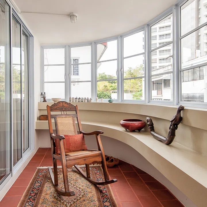If purchasing the right furniture fit for a rounded balcony turns out to be too much of a hassle, perhaps it is a sign to pause and find another solution. Instead of forcing in furniture that might sit oddly in the curved space, consider built-in alternatives. While it is more expensive, it allows you to really utilise the full space.
