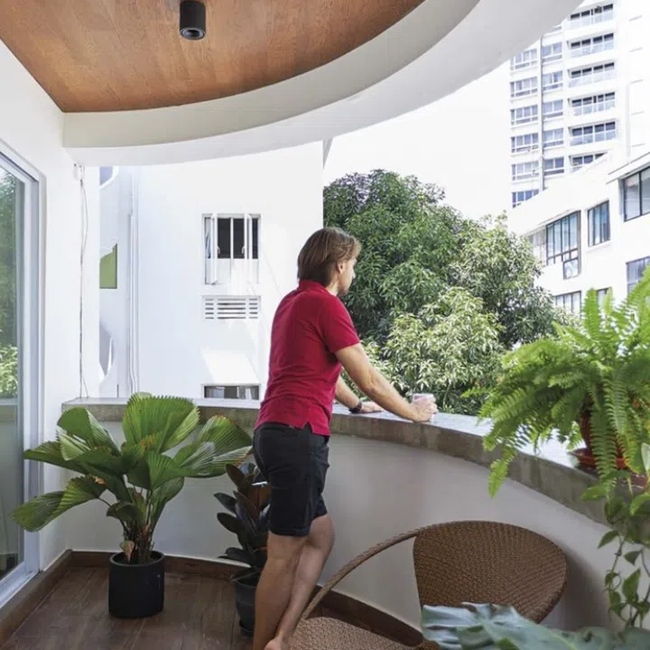 Given the opportunity, enclose your balcony with semi-permeable materials such as appropriate meshing for a good balance of openness and privacy. Invisible grille systems work well with more organic balcony shapes too. Alternatively, child-proof netting would be a good choice if you have young children. Consider using similar-looking tiles or finishes that extend from the living room to the balcony for a seamless look.