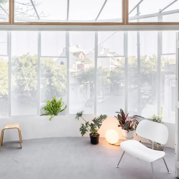 Keep the area uncluttered with minimal furniture, while maximising viewing angles provided by the curved design that opens up to the outdoors. Throw in a few potted plants and curate a modest outdoor garden. Pair this with some simple furniture for a relaxing, easy-going lounging experience.