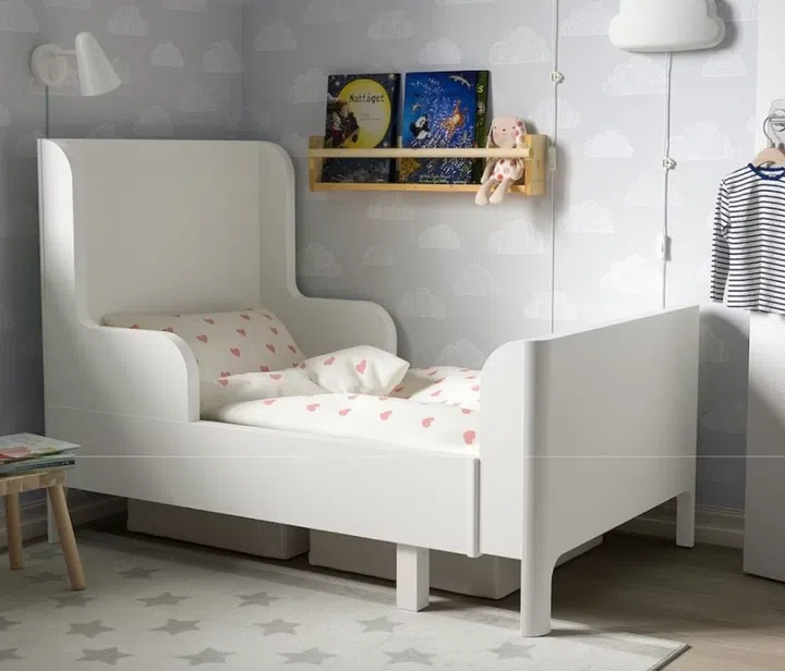 BUSUNGE extendable bed retails at $319, with colour options of white and pink from IKEA.