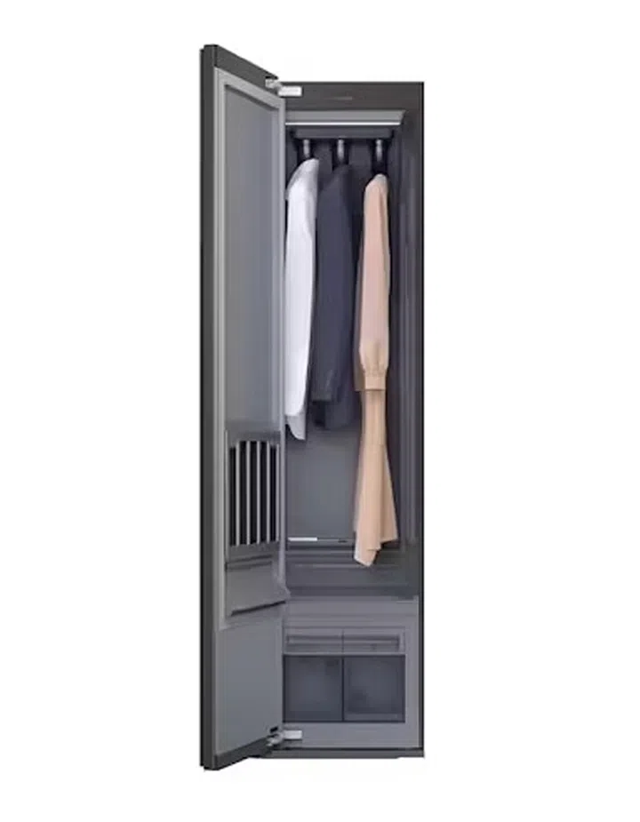 Meet the next-generation clothes dryer, better known as a steam closet, the Samsung Bespoke AirDresser. Unlike a bulky conventional clothes dryer, the smart airdresser steams and sanitises your clothes with the familiar heat pump technology without any tumbling, and you can even control it via an app.