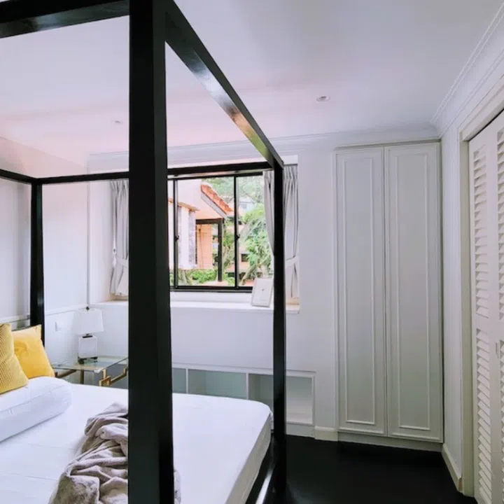 In the master bedroom, the four-poster creates a focal point in the otherwise all-white bedroom. A white louvre door separates the sleeping quarters from the walk-in closet.