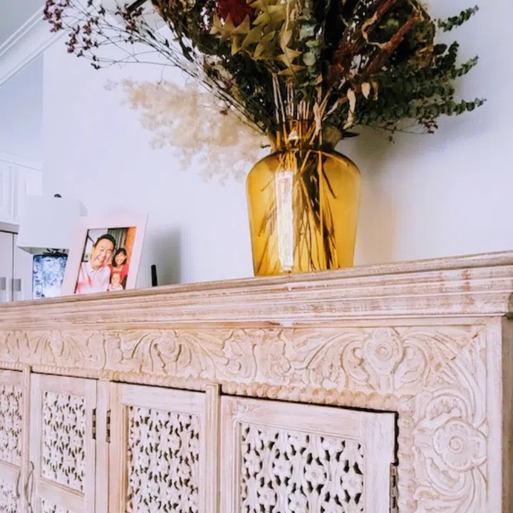 An light, neutral, intricately-carved cabinet like this one helps to balance out the heavier elements while still lending visual interest.