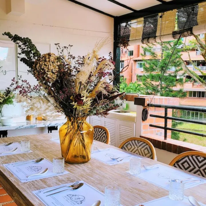 The dining area is set in the 150sq ft balcony, which overlooks a lush green field. Ceiling beams, traditional rattan awnings, and a scrubbed wooden table complete the look.