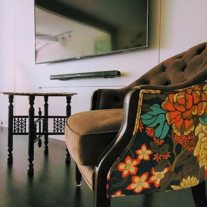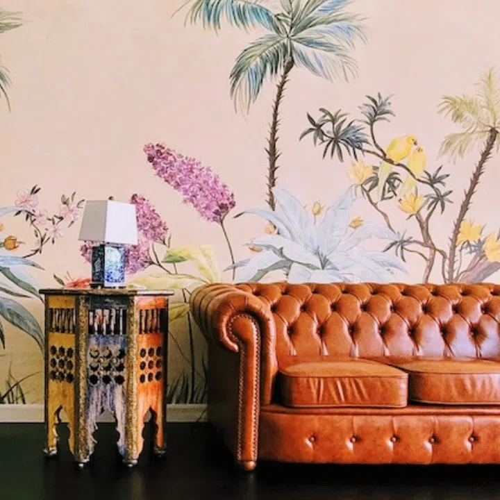 In pride of place in the living room is the seven-metre wallpaper, outfitted with bright floral wallpaper that breathes life into the living room and reflects the greenery outside.