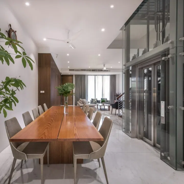 The long wooden dining table offers ample room for large social gatherings. For easier access to the different levels, Mark also installed a lift.