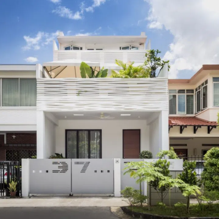 The home was rebuilt as a three-storey house, with a light facade and plenty of greenery. If you look closely at the lattice on the second floor, their house number shows up – a clever visual enhancement.