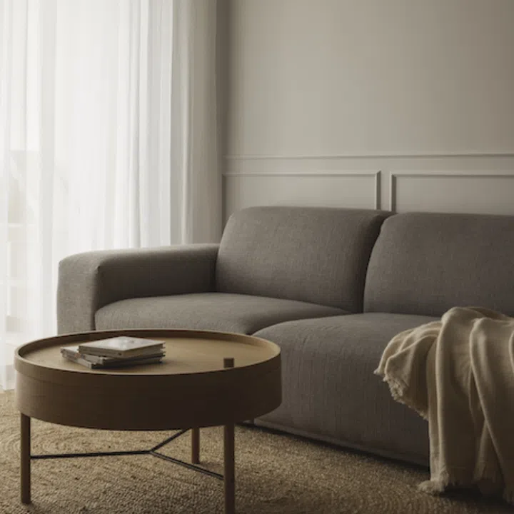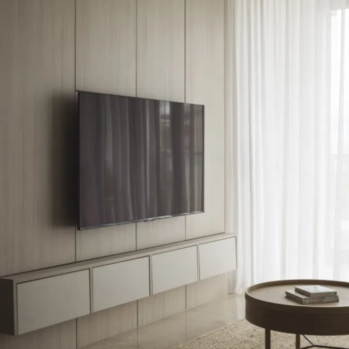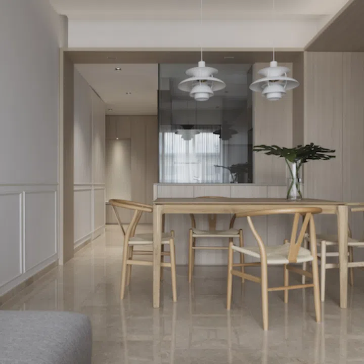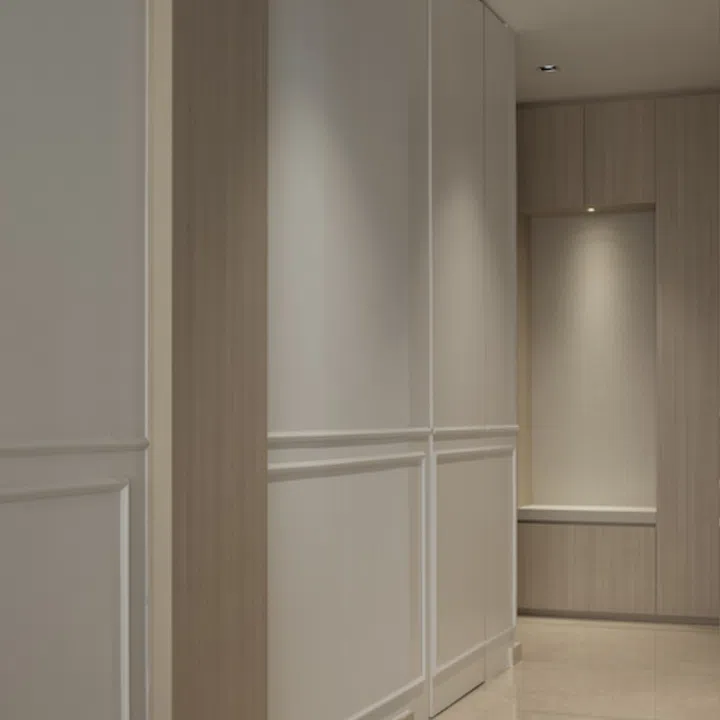 Lighter neutral hue laminates are selected for Living and Dining, and the darker tones for the Bedrooms. Half wall mouldings were also added, bringing some subtle classic details and character within the various spaces.
