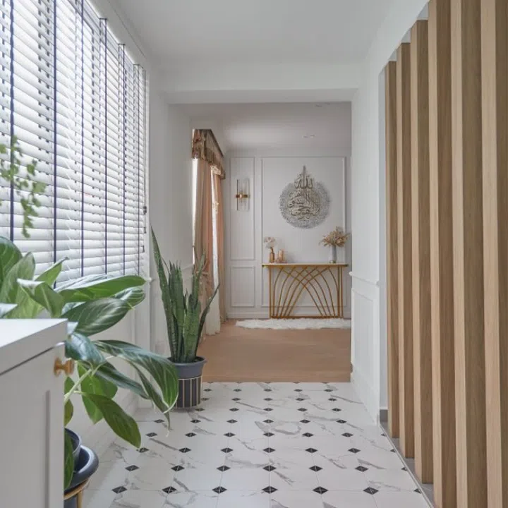Guests are greeted by classic marble tiles that line the foyer. The elegant shoe cabinet is embellished with a small, simple golden knob. The gold accents of the potted plant holders, table centrepiece and wall lights tie in this modern regal look.