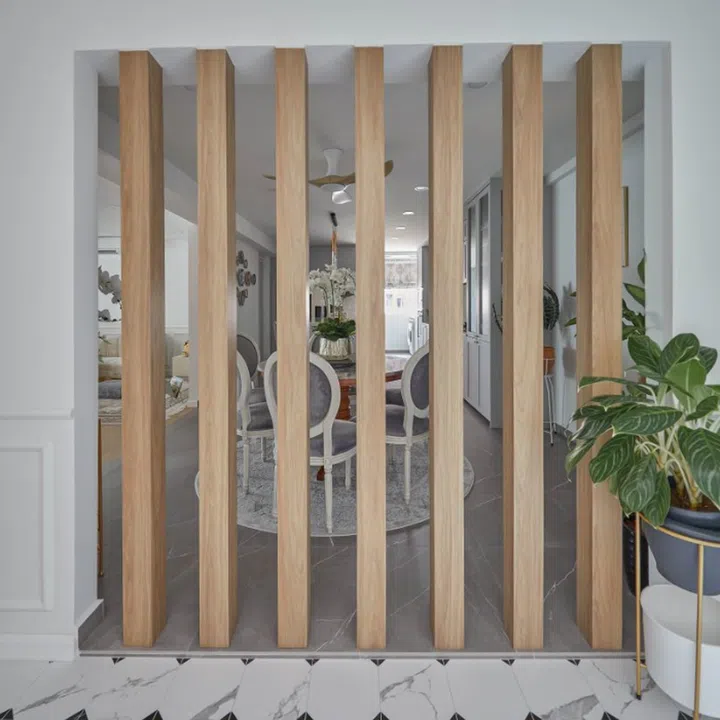 Previously a solid wall, one side of the foyer was hacked. Wooden beams now offer guests a peek into the kitchen and dining area, adding visual depth and making this home more spacious.