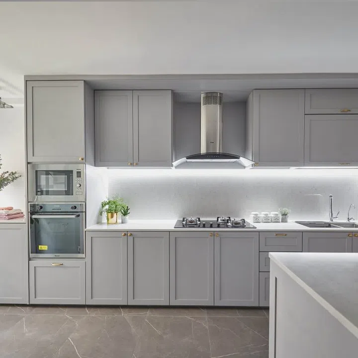 The kitchen cabinetry feature wainscoting details like a classical Victorian abode. The light grey matches that of the furnishings. The golden knobs and handles keep the fine interior details consistent throughout this home. A mix of display cabinets and concealed storage were incorporated to accommodate the homeowners’ extensive collection of crockery, drinkware and kitchen accessories.