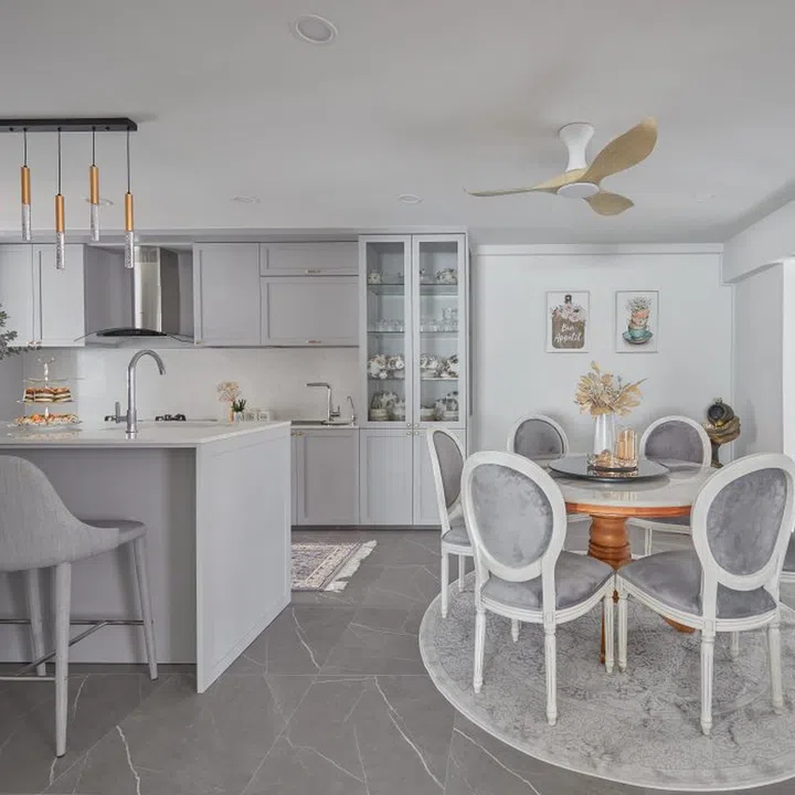 What was once a study room next to the kitchen has been hacked and transformed into an open kitchen concept. A 6-seater round dining table with a marbled top and a functional kitchen island sits in this space. Furnishes with light grey hues were picked to accentuate the contemporary Victorian kitchen. Hanging pendant lights and tabletop ornaments add visual flair.