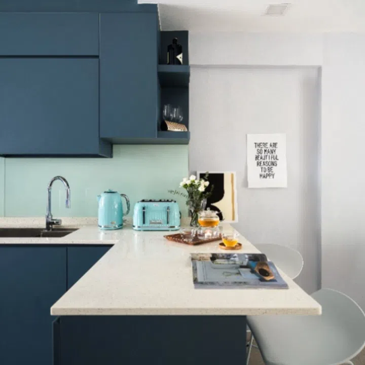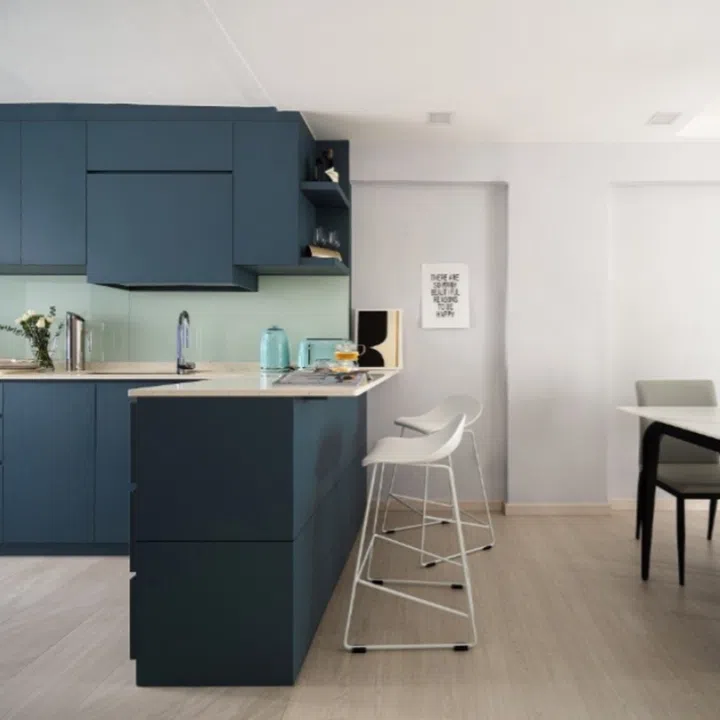 This flat – situated in Mei Ling Street – was a blank canvas to start with, so interior designer Dolly created a cosy yet airy atmosphere with a palette of predominantly blues, greys, and whites. The resulting look is a modern oasis that the homeowner looks forward to coming home to.