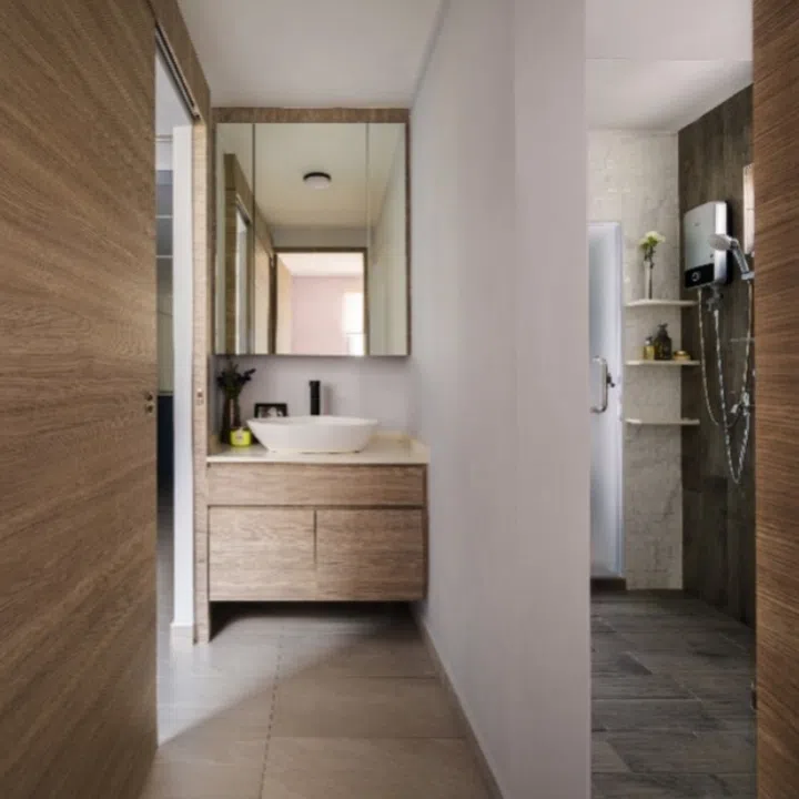 A pronounced wood grain for the doors and cabinets, plus a carefully-curated mix of tiles in the bathroom, lend visual interest to the home. “A balanced and harmonious contrast in texture is like music to interior design,” says Dolly.