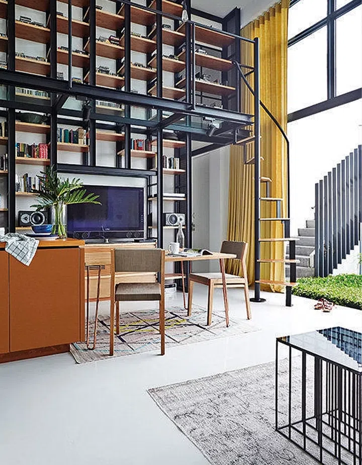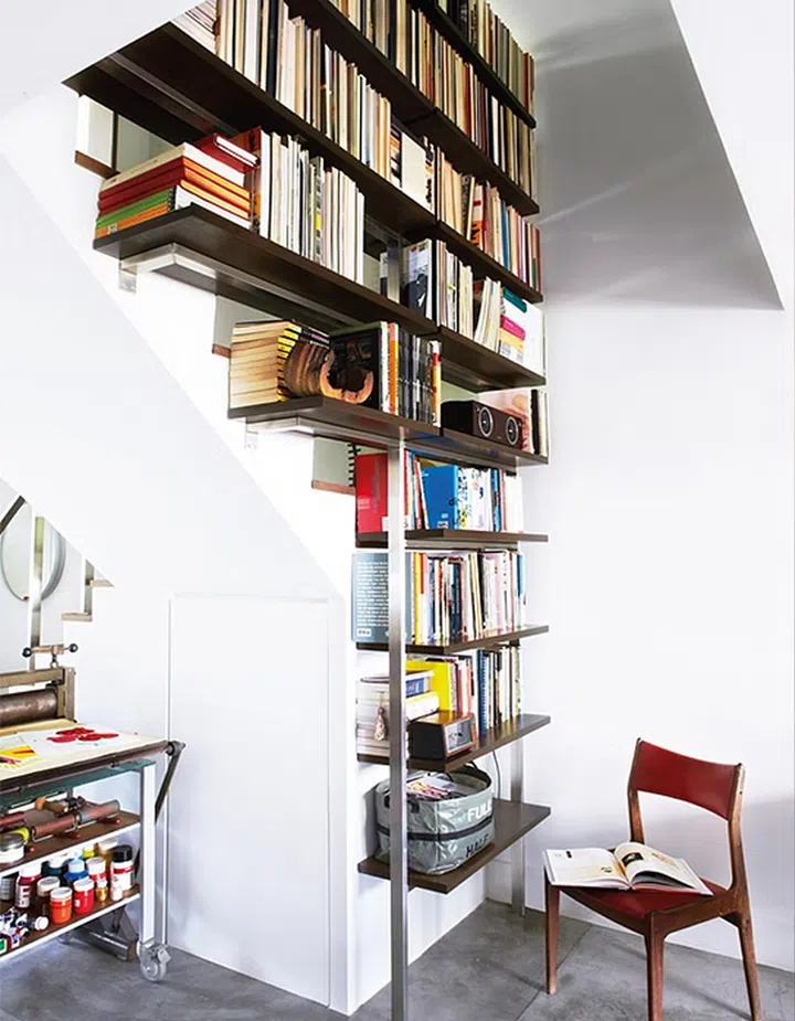 Taking advantage of the high ceilings, the designers created a mezzanine floor so as to access the books on the very top.