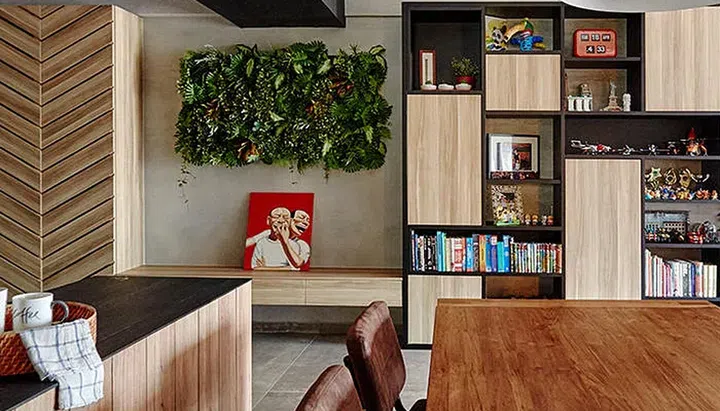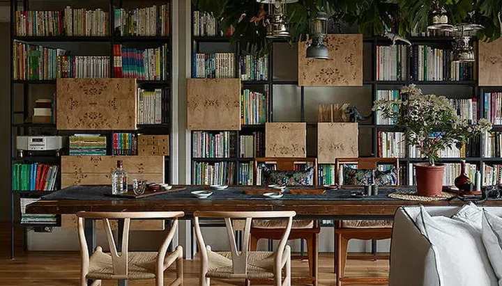 To set a warm tone throughout the space, wood was the main material used for built-ins, such as this bookshelf.