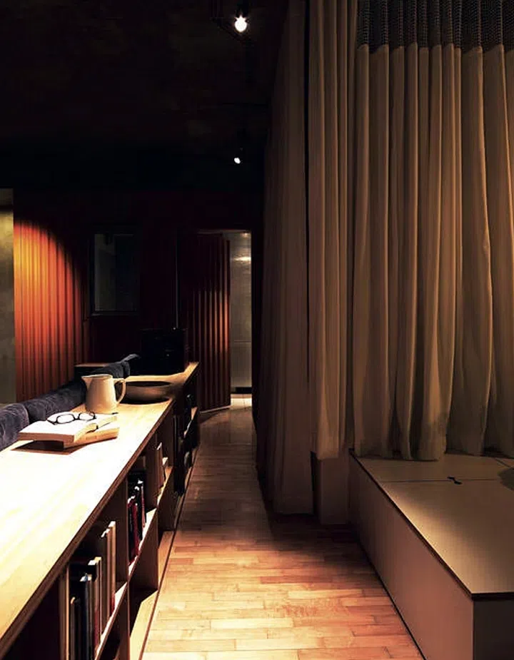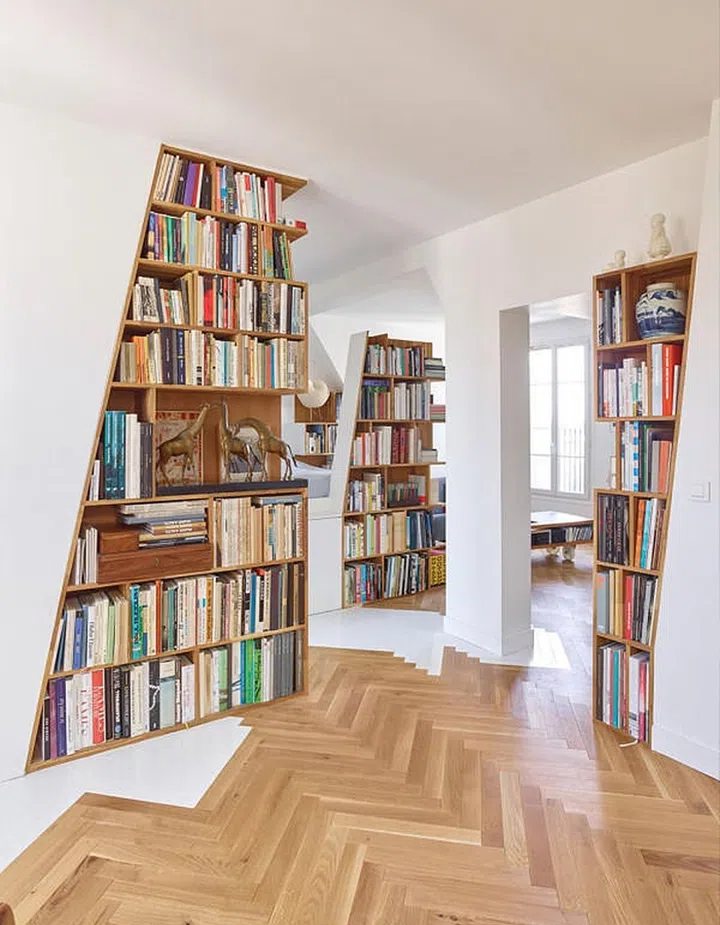 This Parisian flat was designed to include five bookcases, big and small, which separate three living spaces.