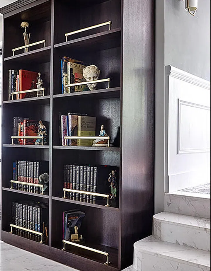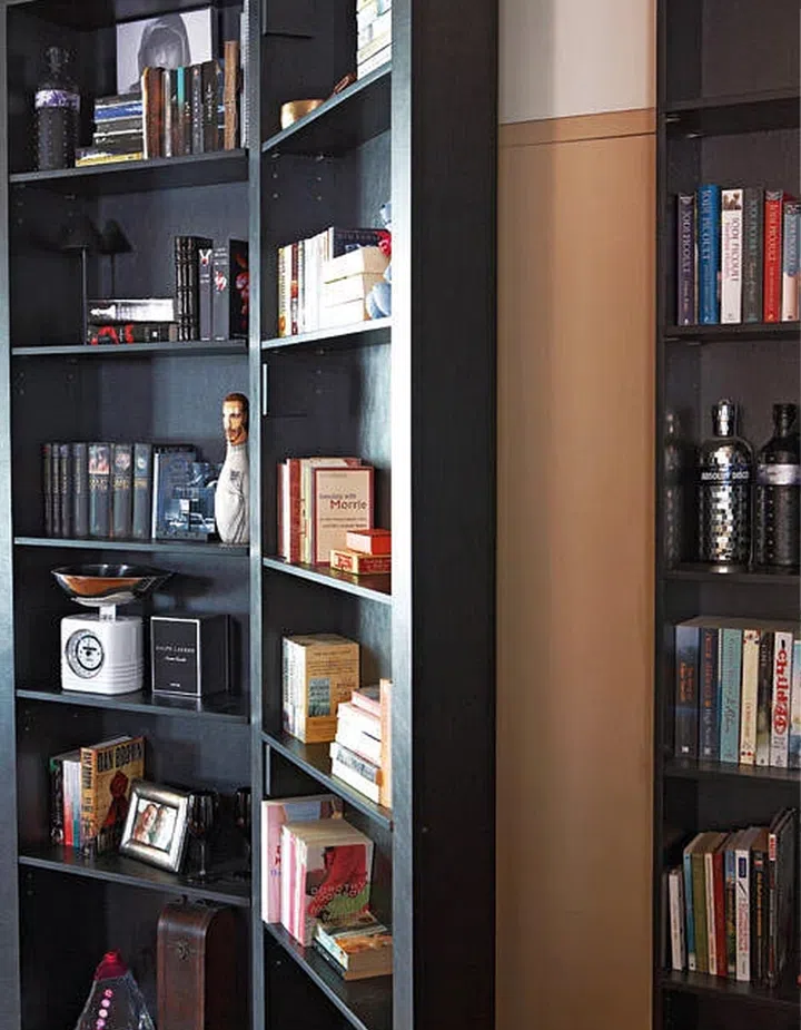 Gold handles give this bookshelf an Art Deco look. This bookcase also conceals the store room entrance.
