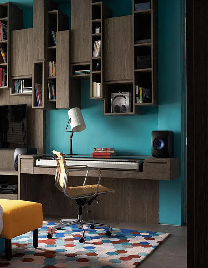 No need for a feature wall when your bookshelf is in a creative, geometric arrangement.
