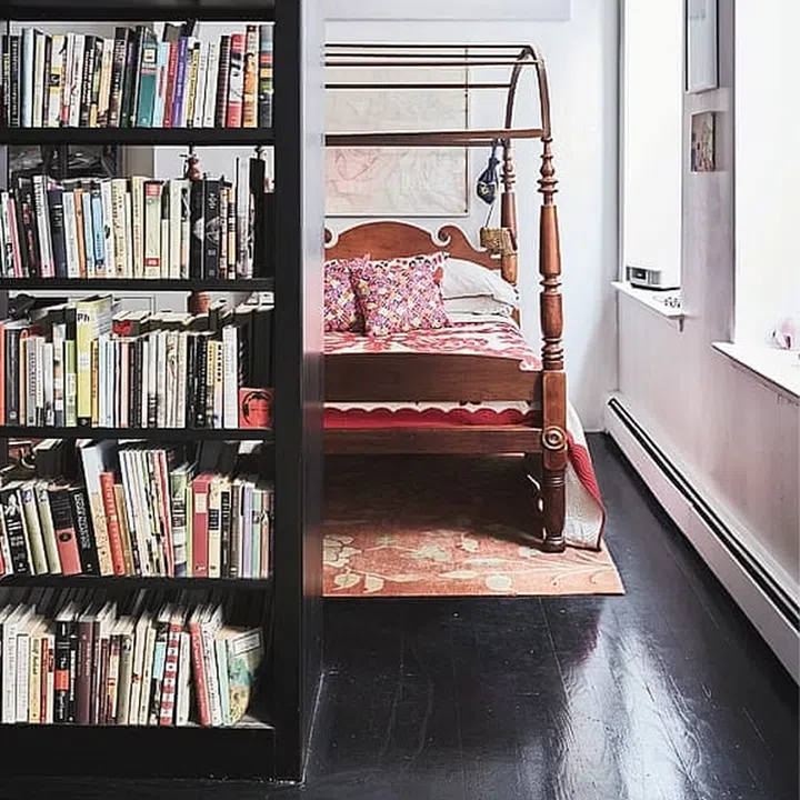 A wall divides the dining area and bedroom, but it is concealed behind this large bookcase.