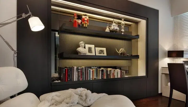 When designing your customised bookshelf, include ambient lighting for a cosy living room.
