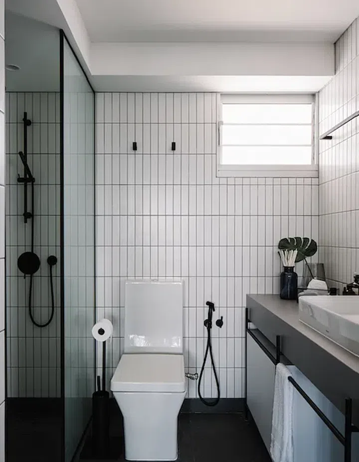 Tommy used pure white tiles to create a hyper sterile aesthetic that contrasts with the darker living spaces.