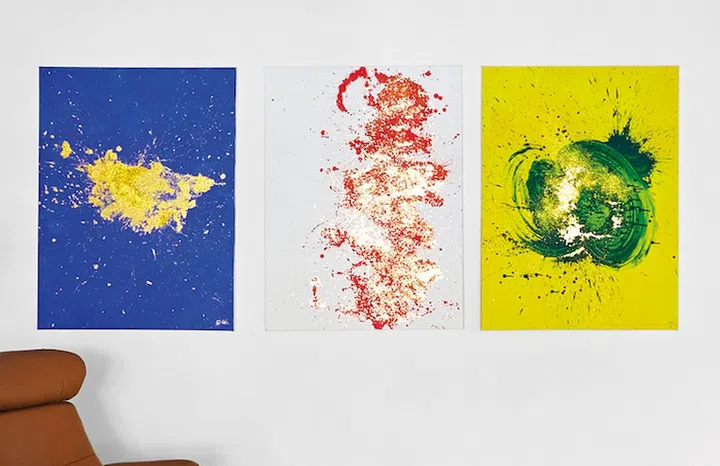 On the far wall is a triptych of artworks created by Maddy and one of her best friends. “She asked me to think of three words as the intent for this house when we made these artworks. I thought of love, peace and joy.