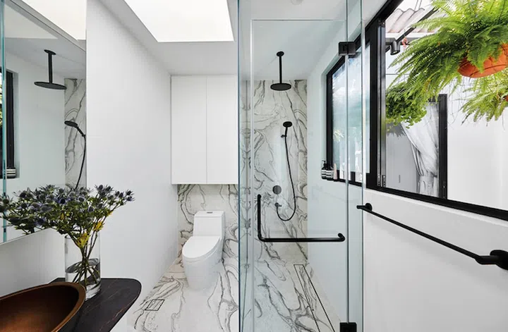 The master bathroom is clad in compact surface Dekton Liquid Sky that lends a graphic touch. The windows open onto the courtyard.