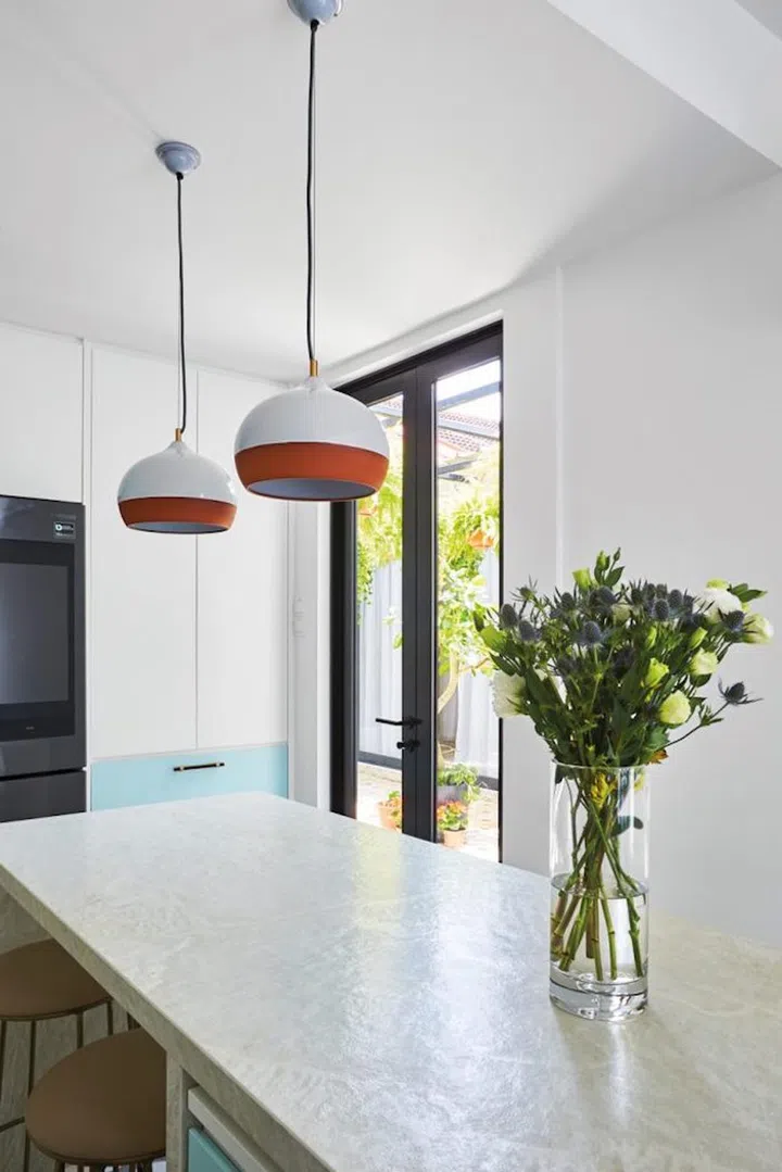 The result is a chic kitchen that balances Maddy and Gabriel’s taste. Palladian terrazzo flooring with broken marble slabs, terracotta pendant lights by British studio Hand & Eye and mint green Smeg appliances are paired with Dekton Liquid Shell countertop, whitewashed walls and the all-chrome fridge, stove and hob.