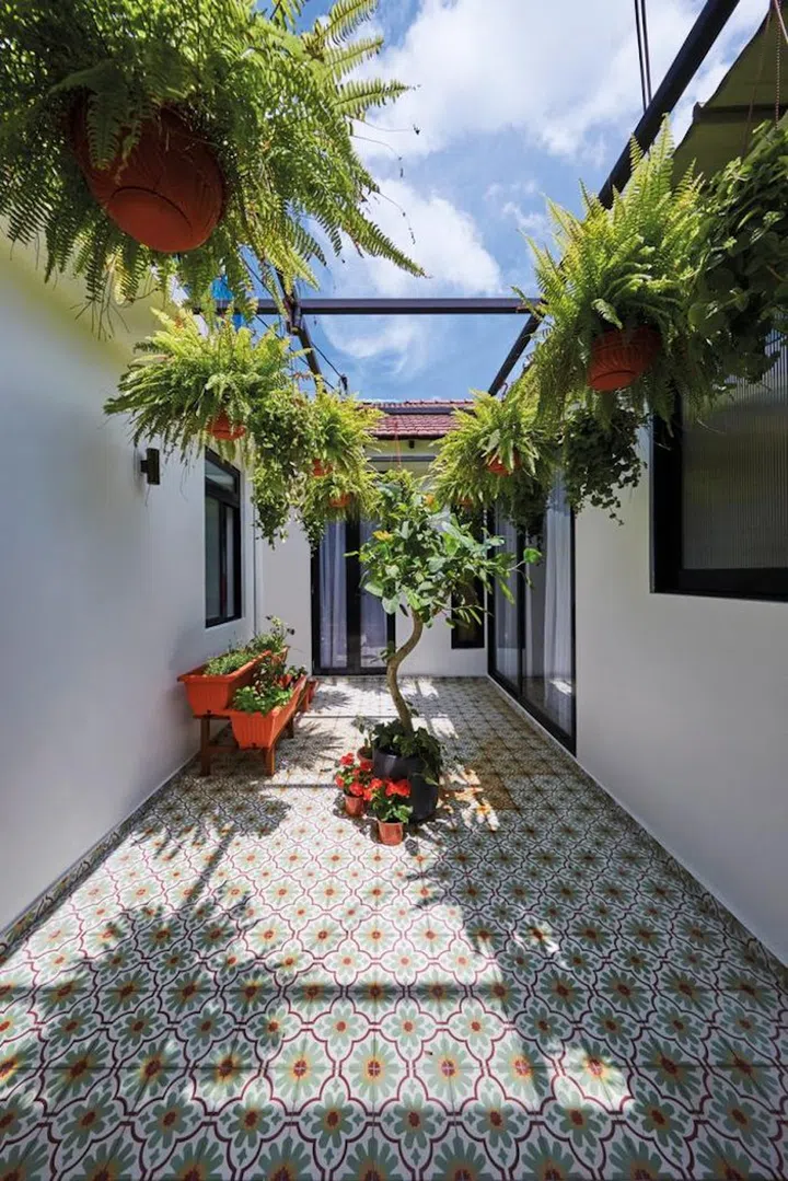 Previously a place for drying clothes and a dumping ground for random furniture and appliances, the courtyard is now a lush sanctuary with hanging planters, a large potted ficus and a herb garden finished with charming decorative tiles. All the bedrooms (except the younger daughter’s) and bathrooms are oriented around it.