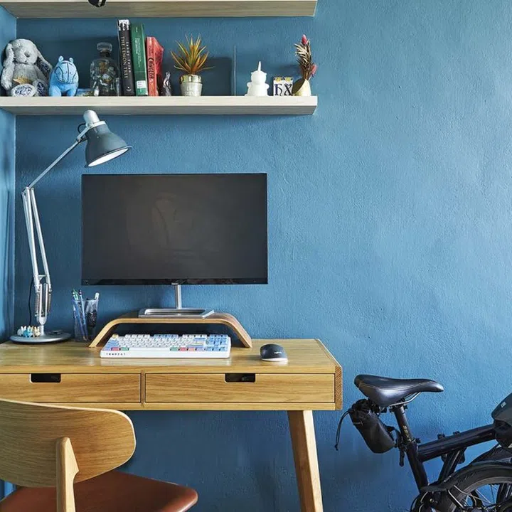 The study corner in the younger daughter’s room pairs teal walls and warm timber furniture.