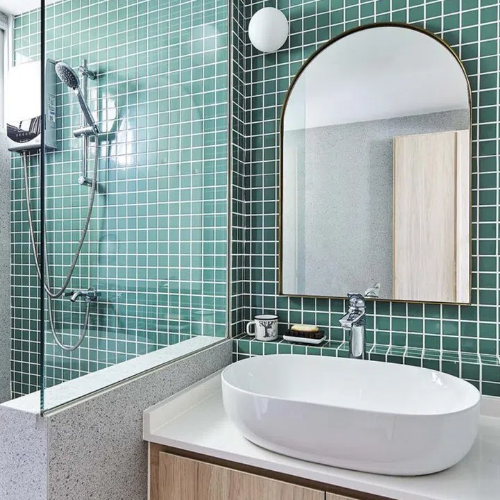 Meanwhile, the common bathroom features a more cheerful deeper green tile with white grouting that lends a graphic touch.