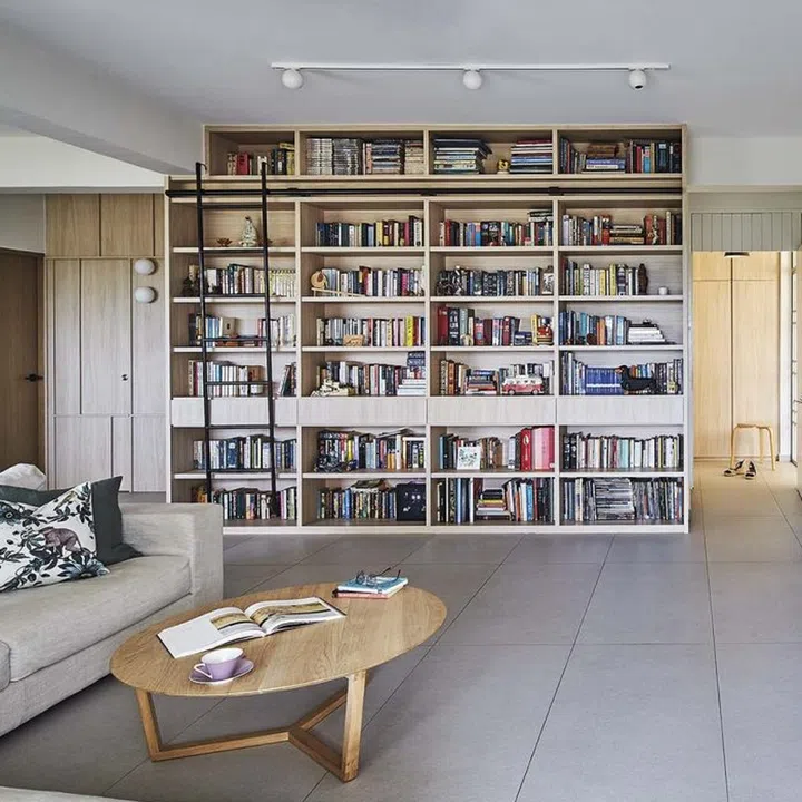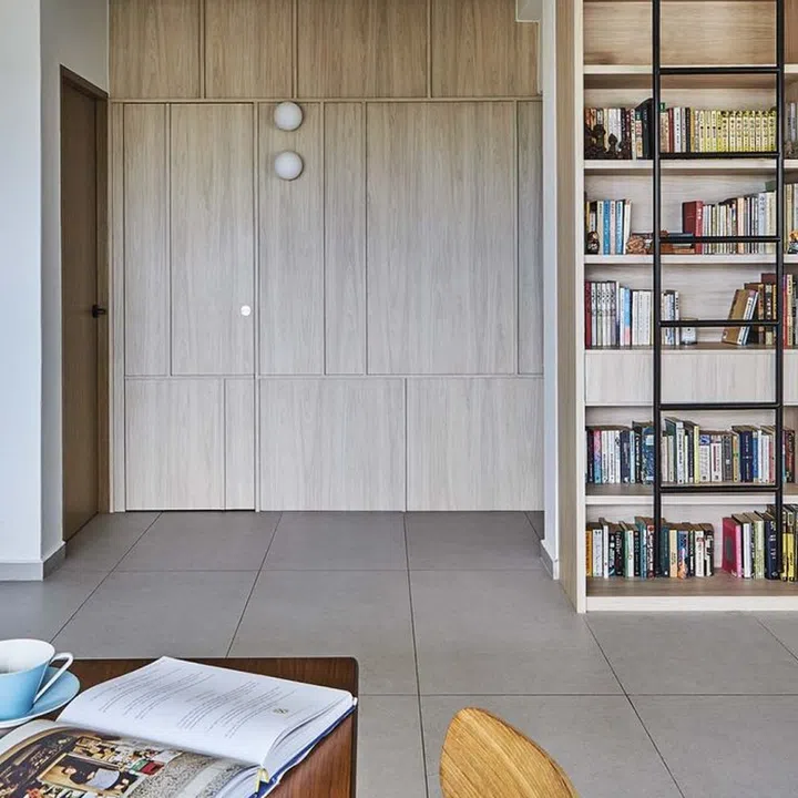 Pale wood laminate clad the wall concealing the bathroom door, visually tying the space with the bookshelves.