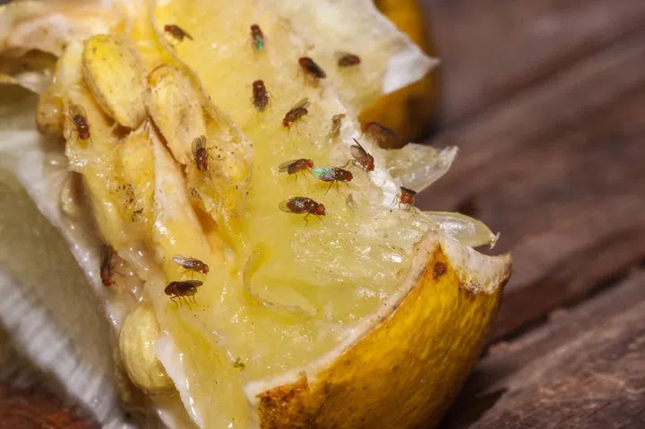 Yet another winged pest is the fruit fly. They’re commonly seen infesting fruit or hovering around rotten fruit. Despite their small size, fruit flies can turn into a huge nuisance, especially once they start breeding. What sets them apart from other flies is their yellow-brown colour and bright red eyes.