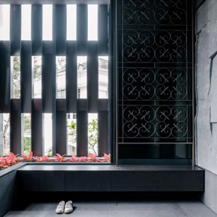 When visitors step into the house, they enter a foyer – a largely empty space, save for a set of wall-mounted grilles. These are no ordinary grilles, but are the ones found in the old house. “They were rusty, but we managed to salvage and restore them,” says Lim.