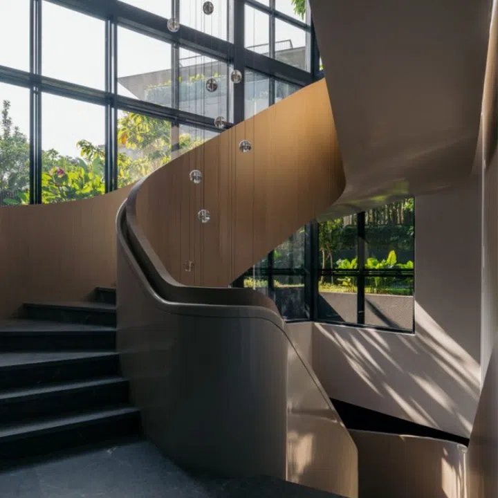 Connecting the basement, where there is a guest room and gym, to all the floors in the house, is an organically shaped staircase. “The curves provide a contrast to the overall angular architecture of the home,” says Lim.
