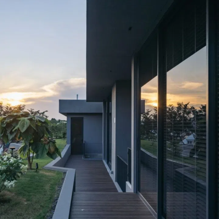 On the outside, the house looks like one massive block, partially covered on the side with a series of aluminium panels that act as sun shading and privacy screen.
