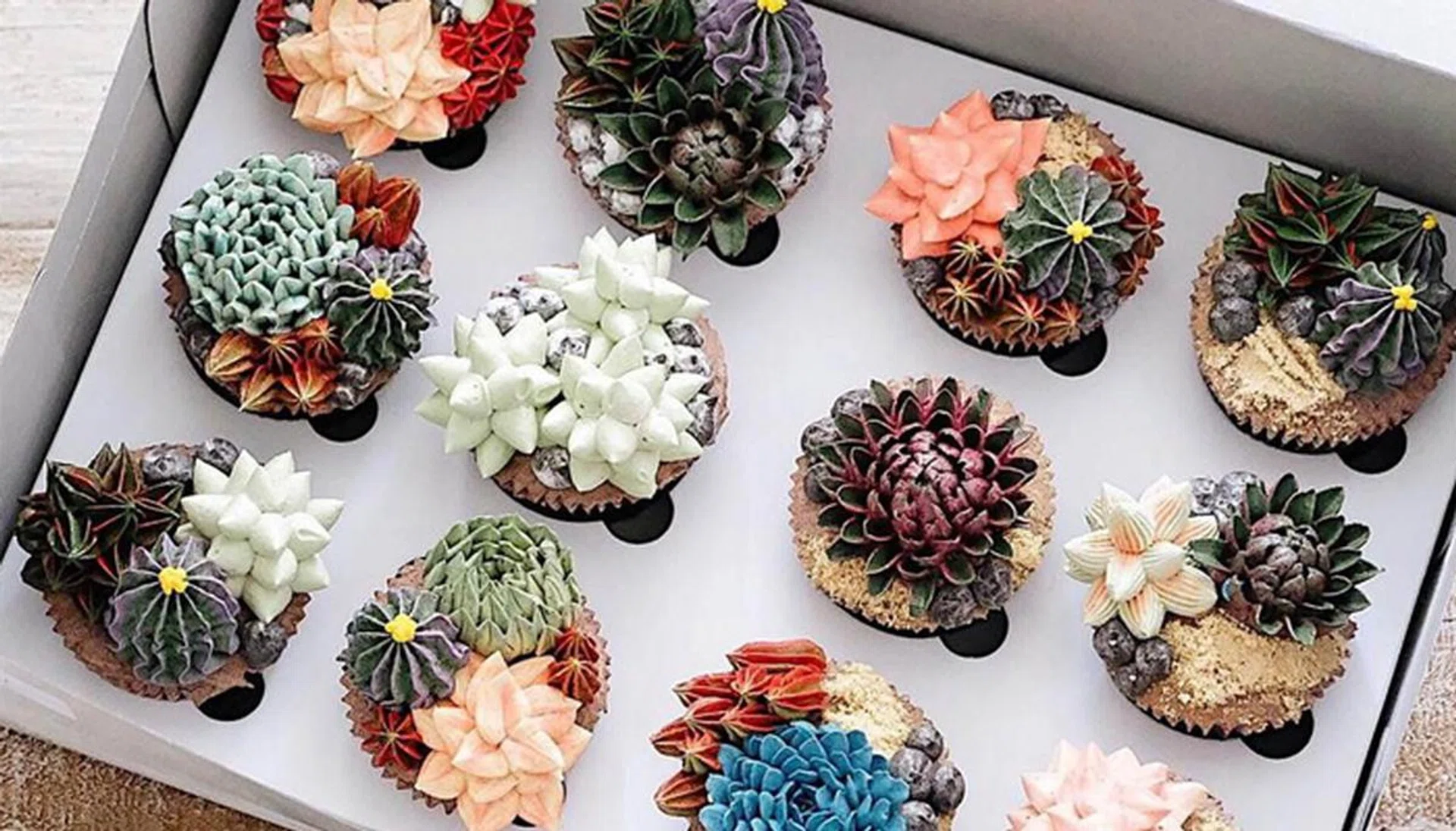 The beauties are made by piping colourful buttercreams into patterns that resemble succulents.