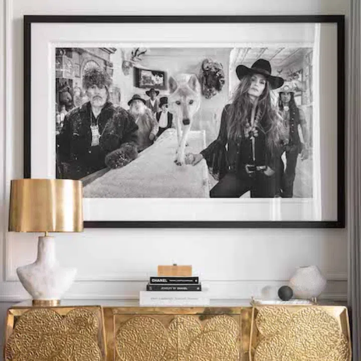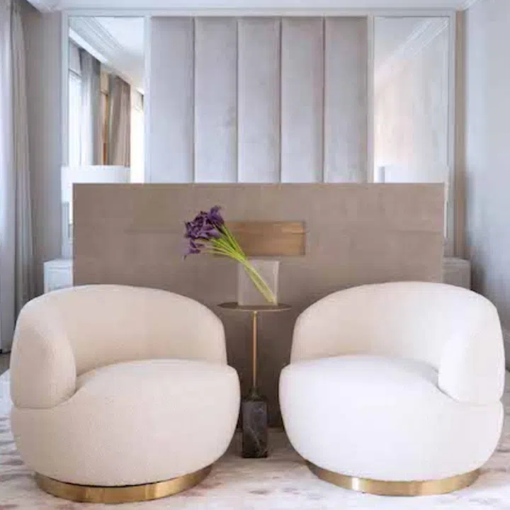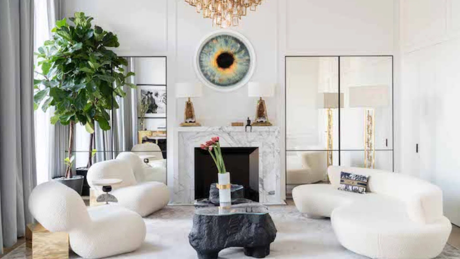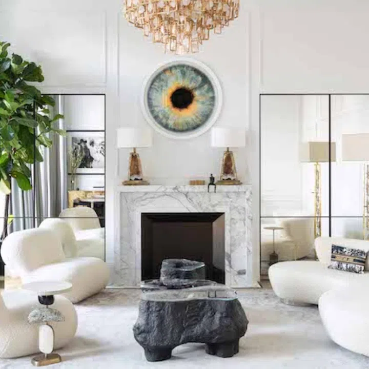 For the bedroom, British artist Bianca Smith also painted a portrait of the client called “Josephine Dancing in Heels with Fans and a Glass of Champagne. Mark Quinn’s spectacular round work for the living room was bought from a private collector.