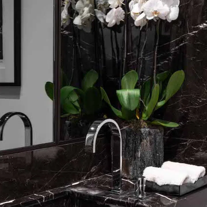 The black marble countertop in the bathroom pairs beautifully with the white walls.