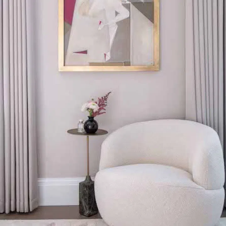 Armchair by Liang & Eimil; side table Elude; on the wall is Bianca Smith’s “Josephine Dancing with Fans and a Glass of Champagne”; curtains by Mark Alexander.