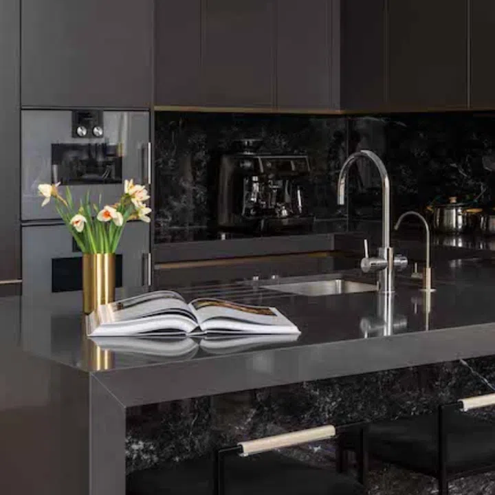 In contrast to the cream palette running throughout the rest of the home, the kitchen features dark hues with the cabinetry and countertops in matte black.