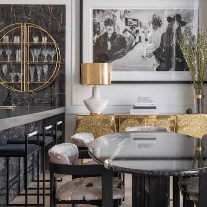 The dining table was designed by Carlo Scarpa; chairs, Gallotti & Radice, in fabric from Dedar; bar stools, by Crea; table lamps designed by Kelly Weirstler for Visual Comfort & Co .; vases designed by Jean-Louis Deniot for Baker.