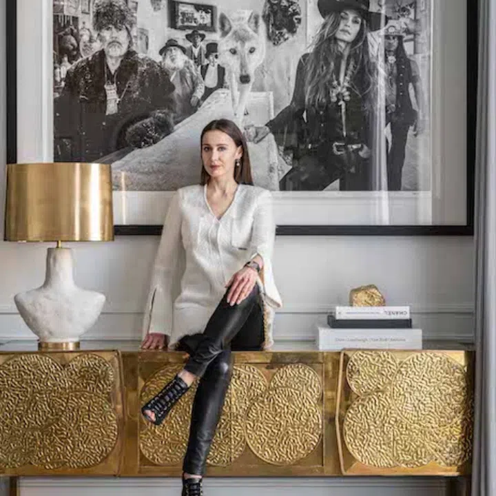 The interior reflects the cheerful character of the owner, who is captured dancing with fans and a glass of champagne in a painting by the British artist Bianca Smith.