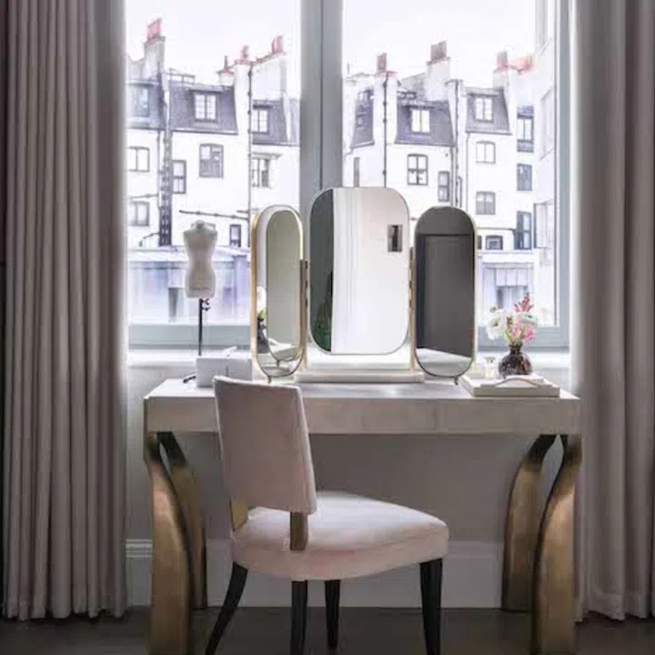 The dressing table sits by the window in the master bedroom, looking out into the picturesque view of central London.