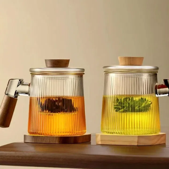 This glass mug is ergonomic and practical, with a detachable glass lid that does double duty as a tea strainer. It’s easy to clean, and thanks to its pleated glass design, you can monitor the tea’s strength during brewing. Made of high-borosilicate glass, you can choose between a walnut or oak handle.