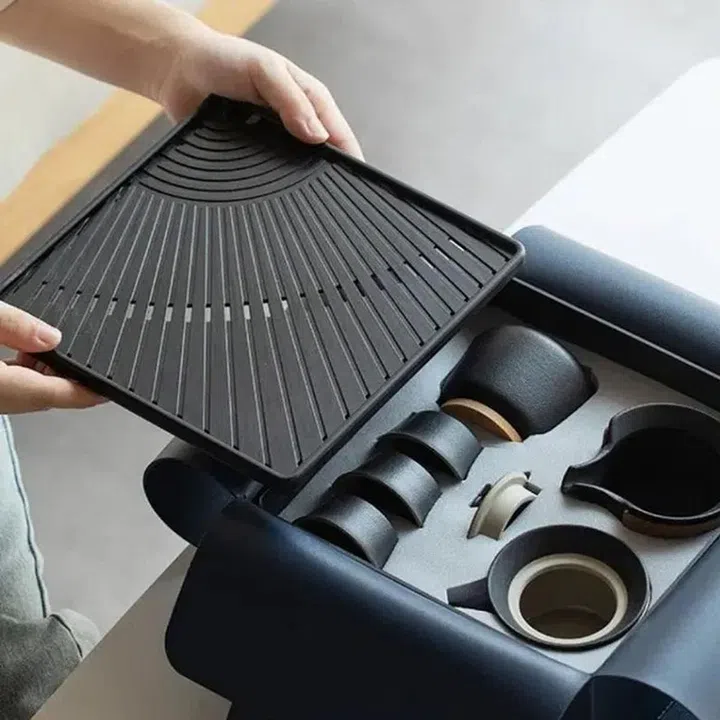 This modern, minimalist tea set is inspired by Japanese Zen gardens. With its teapot, tea canister, pitcher and three cups, this teaset is perfect for entertaining guests or as a gift. The tea tray is also a water reservoir, so you can use it for traditional tea-making, which involves rinsing the cups and leaves for a cleaner taste. It also comes with a cushioned vegan leather carrying bag, so you can enjoy tea wherever you go.