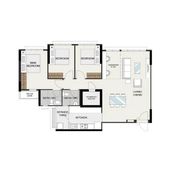 Back to the more conventional layouts, here’s one to consider if you are fortunately still able to work from home. One of the common bedrooms can be turned into a study/office area. If you’d still like to retain a guest bedroom, you could install a murphy bed here too.