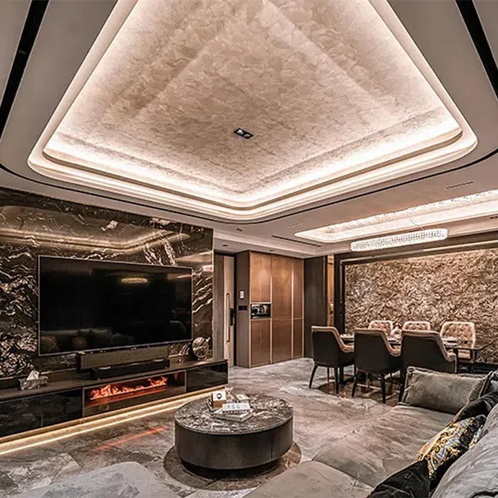 Rather than have a plain white ceiling above the dining table, Wang recessed it and installed stainless steel treated with a texture that mimics how clear water looks on a breezy, sunny day. A crystal pendant light hangs from it, enhancing both the ceiling and wall features.