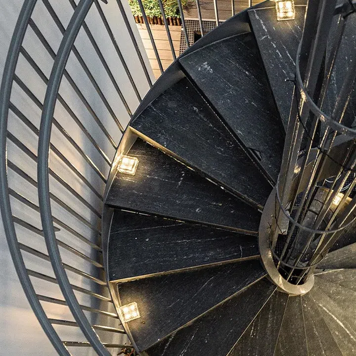 A spiral staircase connects the two, with unique glass cubes covering small solar-powered outdoor lights every few steps. Head up to the pavilion and discover a barbeque pit and ample seating facing Labrador Nature Reserve.